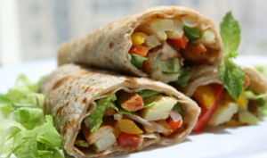 Barbequed chicken quesadilla ½ tablespoon extra virgin olive oil One 8-inch whole grain tortilla 1-2 tablespoons barbeque sauce (or spaghetti sauce, if they prefer it) 1⁄4 cup shredded cheese (whichever kind they like) 1 cup cooked chicken, sliced or diced ½ cup roasted or pan-fried onions (if using spaghetti sauce, other leftover cooked vegetables such as carrots or mushrooms work well, too) Add a little olive oil to a skillet and preheat on medium heat. Place the tortilla in it. Fairly quickly (because you want to get everything on before the bottom browns too much) spread 1-2 tablespoons of sauce on the entire tortilla. Cover just half with the chicken and onions. Then top that half with shredded cheese. Fold the other half of the tortilla over the filled half. Press down with spatula to flatten, and cover the pan for 1 to 2 minutes just to melt the cheese. Remove from pan with the spatula. Once cooled, slice in quarter triangles with a sharp knife so filling does not come out. Wrap snugly with waxed paper or aluminum foil and place in a covered container.